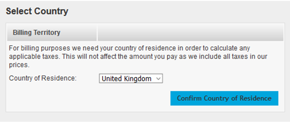 After clicking Proceed to Payment, you will be asked to pick your Country of Residence from the Dropdown. After you have done this, click Confirm Country of Residence to continue.